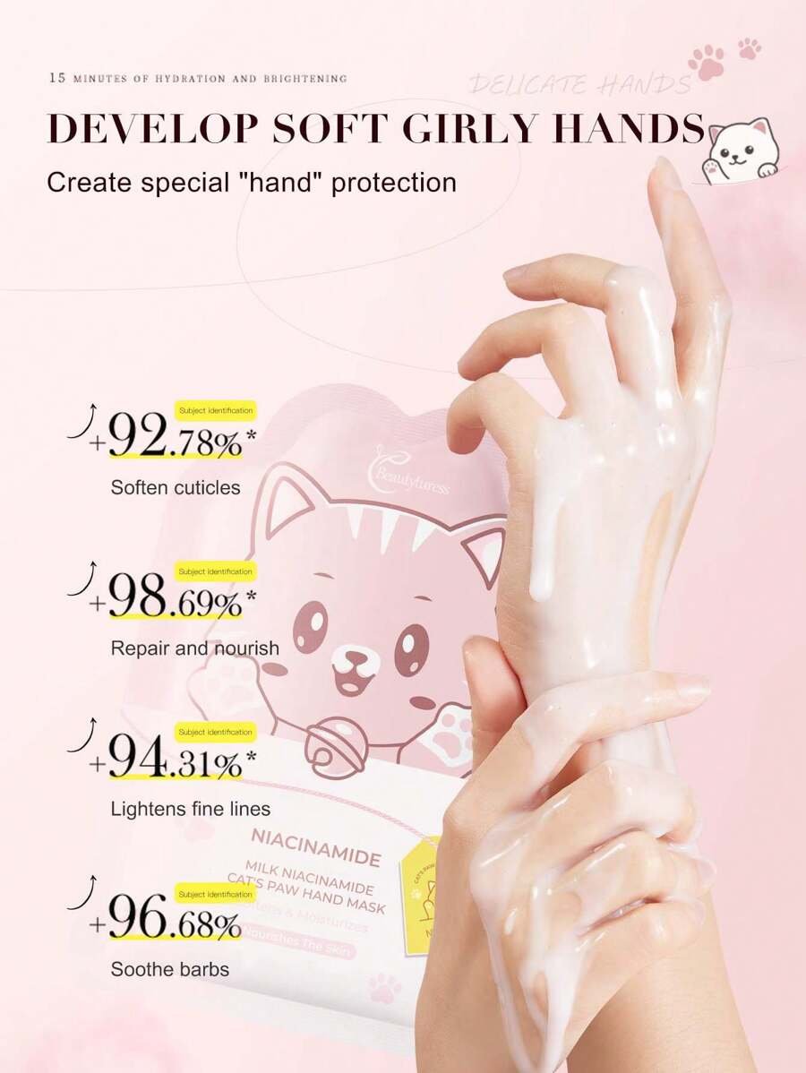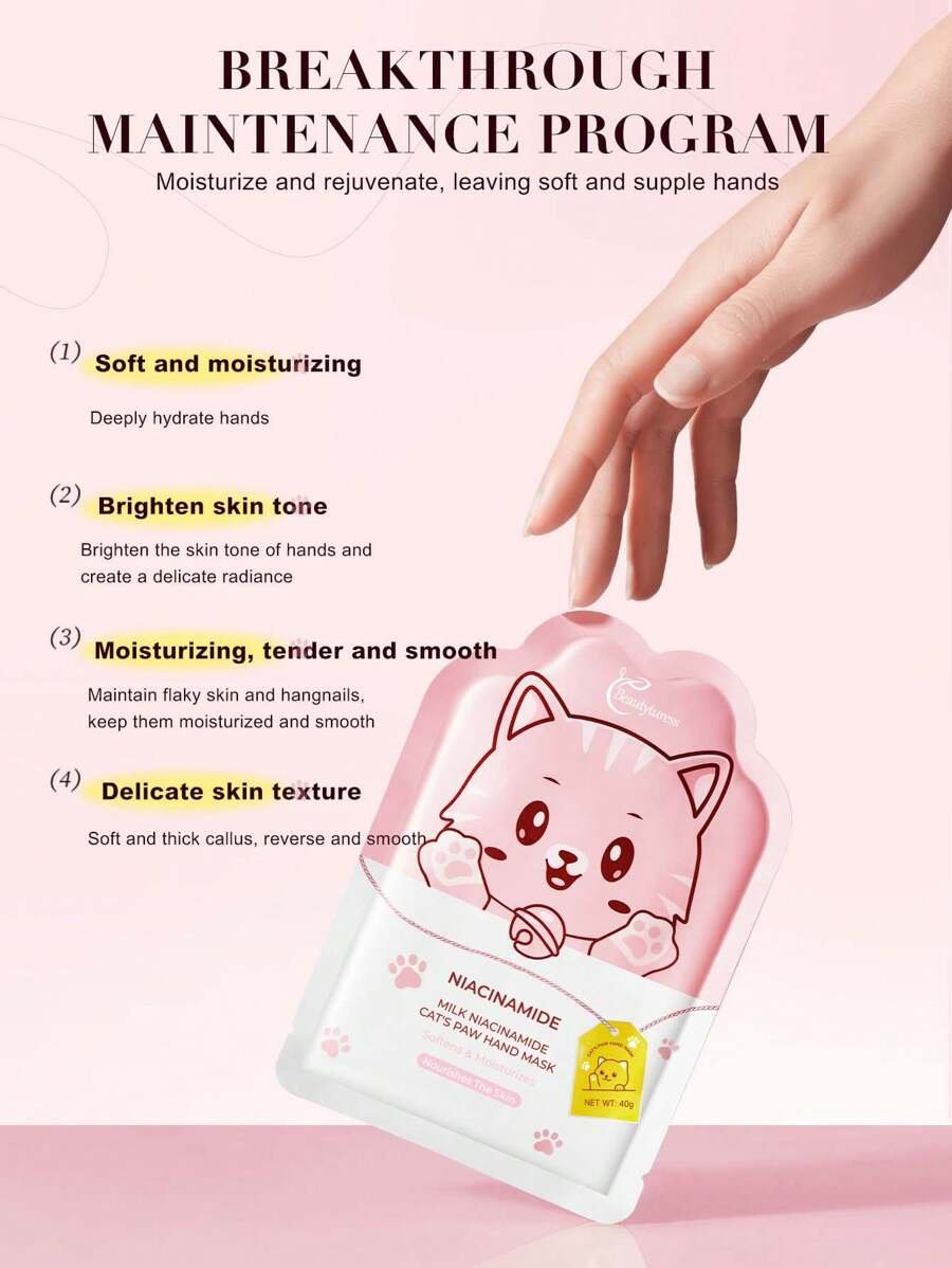دللي يديك مع قناع اليد من نيتسن (NITTHIN) المصمم بشكل لطيف برسمة القطط وبرائحة الحليب الناعمة، بتركيبة غنية تعمل على ترطيب وتغذية البشرة الجافة والمتشققة، وتمنحك ملمسًا حريريًا يدوم طويلاً.